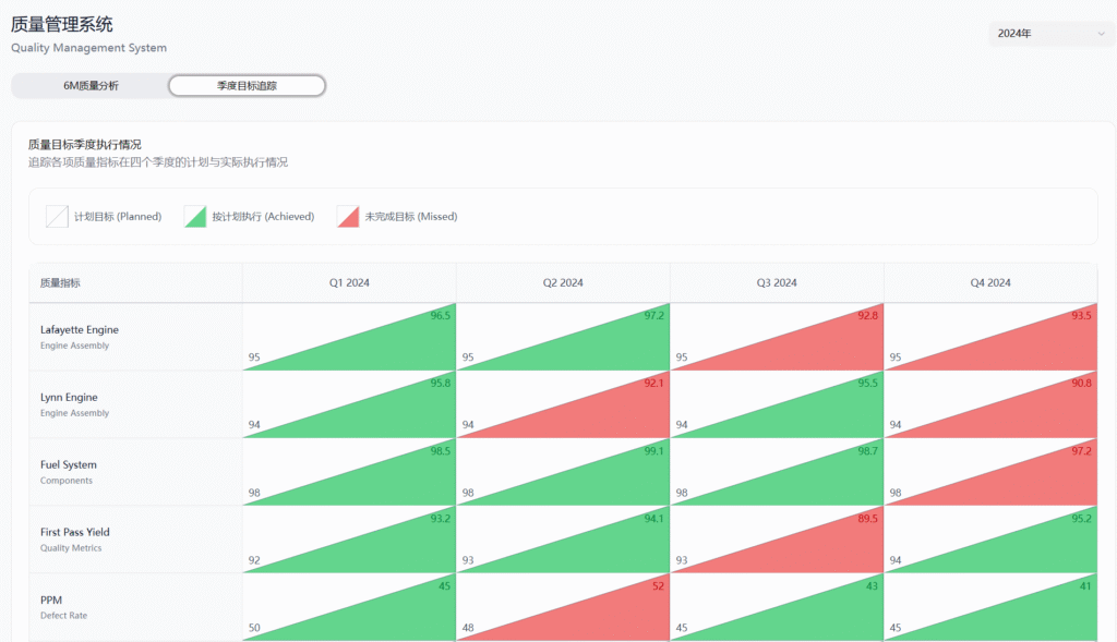 • 自定义质量指标管理:支持自定义企业专属质量绩效体系,实现从年度目标到月度执行计划的逐层分解与可视化进度追踪。