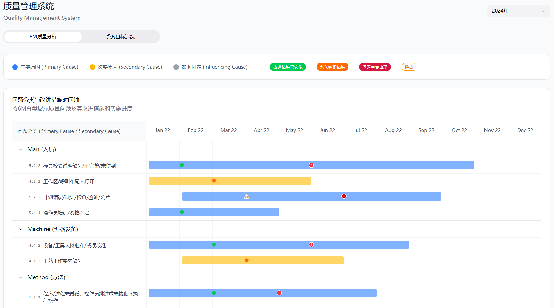 • 智能问题分析与洞察利用大语言模型与AI算法对海量质量记录进行自动挖掘与分析,实现从目标分解、进度追踪到自动6M分析、SPC监控与风险预警的全流程闭环管理。